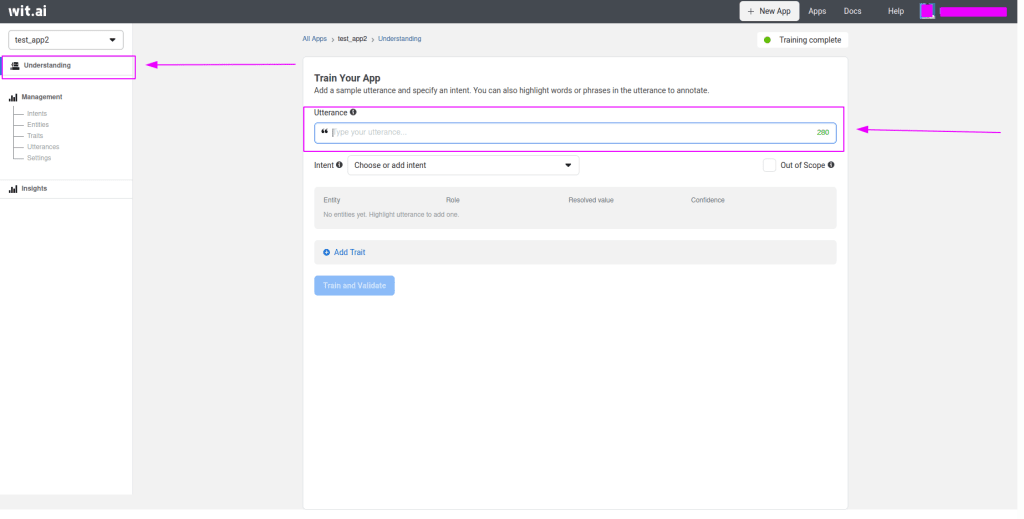 To train your intent,you should add a few samples. Go to “Understanding” and start typing them.