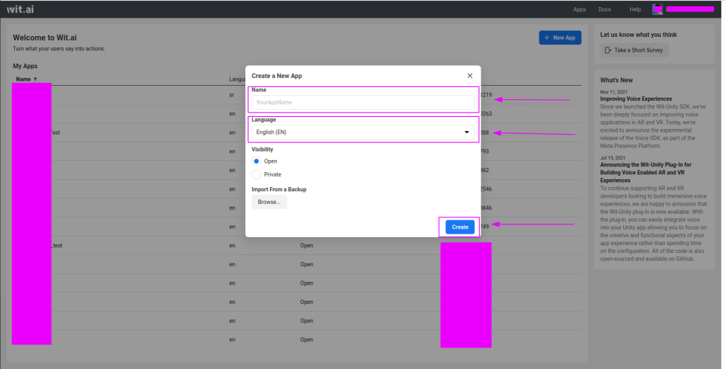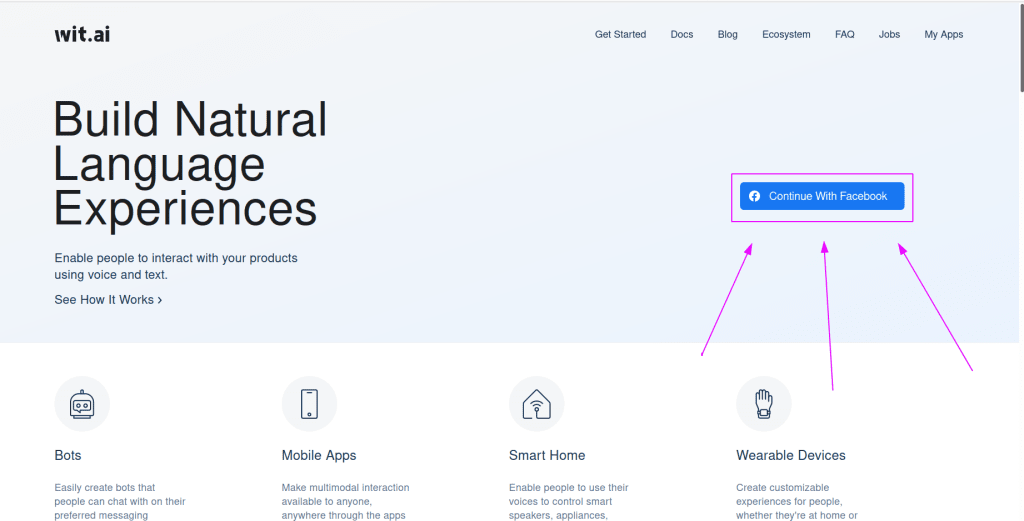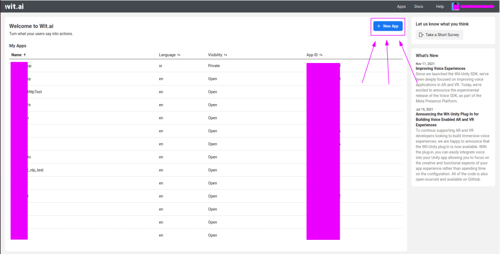 You can sign up or sign in using your Facebook account, to create a new agent, go to apps, and after you open that, click this “New App” button.