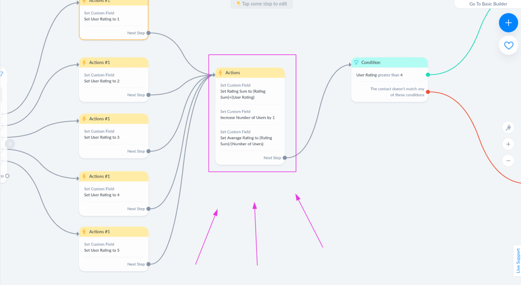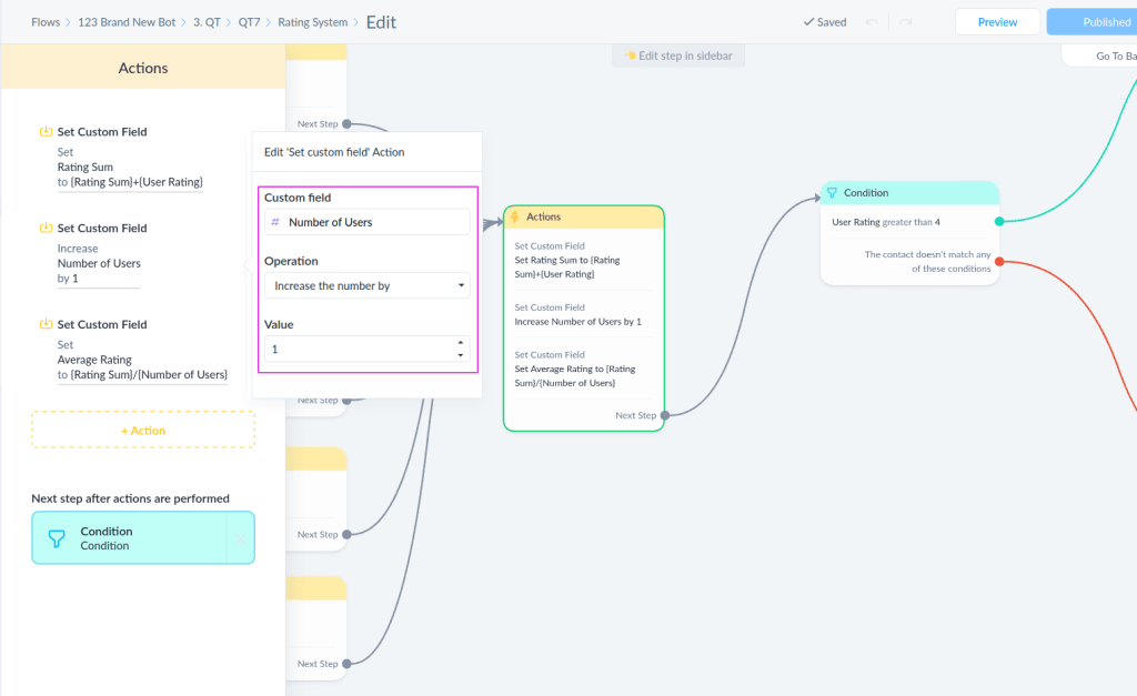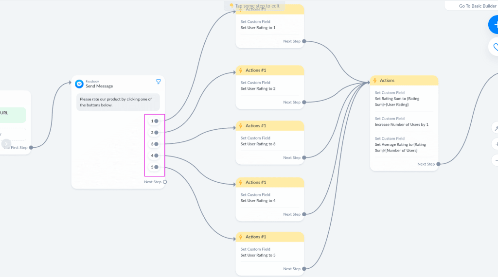So, let’s start from the message where we motivate users to rate our product. We give them a choice between 1 and 5. Then, depending on their choice, we set the User Rating custom field to their rating number. So it can be from 1 to 5. And of course, the user rating custom field that you’re going to make should be a number field.