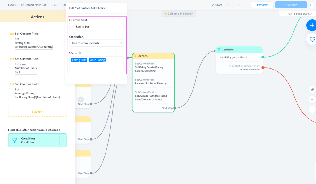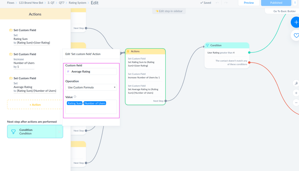 After that, we start another three actions. For this 3 bot fields. Remember, not custom fields, bot fields! We will need a bot field called Rating Sum, we will need a bot field called Number of Users and the one called Average Rating, and they all should be number bot fields.